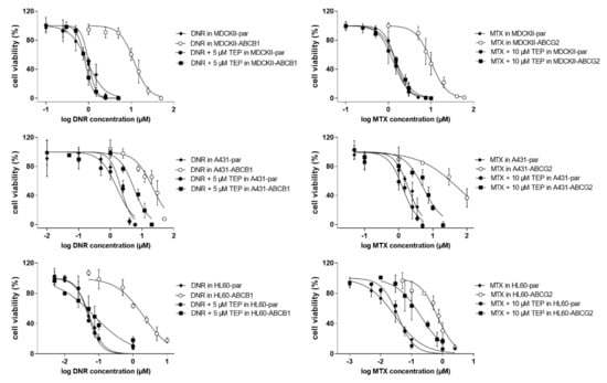 These colorimetric assays were used in various studies presented in this paper (prior induction studies, MDR reversal experiments and comparative viability assays) and were performed as reported previously [,,,]. MTT was used in primary NSCLC cultures and in all cell lines with the except for suspension HL60 cells, for which XTT assay was used. In MTT experiments, cells were seeded on a 96-well culture plate at densities (in number of cells/well) of 1.3 × 104 for MDCKII-par, MDCKII-ABCB1 and MDCKII-ABCG2; 1.2 × 104 for A431-par, A431-ABCB1, A431-ABCG2 and A431-ABCC1; 1.2 × 104 for NCI-H1299; 1.0 × 104 for A459; 2.0 × 104 for Caco-2; 5.0 × 104 for LS174T; and 1.0 × 104 for primary NSCLC explants. On the other hand, for XTT cells were seeded with densities 2.0 × 104 for HL60-par, HL60-ABCB1, HL60-ABCG2 and HL60-ABCC1 cells/well on 96-well plates. For MTT assay, cells were seeded and cultured for 24 h before drug addition, whereas for XTT, drugs were added immediately after seeding. Following 48 h incubation with drugs, Opti-MEM solutions of MTT or XTT (1 mg/mL) with phenazine methosulfate solution (7.50 μg/mL; only for XTT) was added and the cells were incubated for 1 h with the exception of HL60s that were incubated for 5 h. In MTT experiments, cells were lysed with DMSO, in XTT ones, the level of formazan was measured directly. Absorbance measurements for MTT (570 nm, 690 nm as background) or XTT (450 nm) were performed with a microplate reader (Infinite M200 Pro, Tecan).