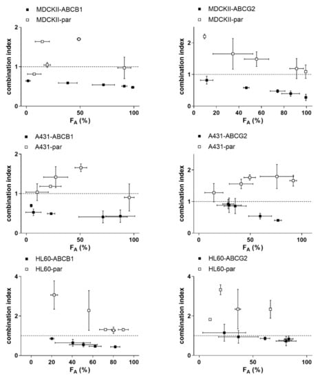 This assay was performed in the similar manner as described previously [,,,]. Experiments with MDCKII, HL60, A431 cell lines and NSCLC patient-derived explants followed the methodology described in the subsection above. Drug combination effects were quantified using combination index (CI) method of Chou-Talalay with CompuSyn 3.0.1 software (ComboSyn Inc., Paramus, NJ, USA). Based on the computed CI values, the effects of drug combinations were classified as synergistic (CI < 0.9), additive (0.9 < CI < 1.1) or antagonistic (CI > 1.1) [].