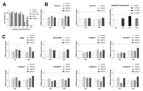 Gene induction studies with tepotinib. Treatments with vehicle-containing media and 40% DMSO in media were used as 100% and 0% viability controls for data normalization, respectively. (A) Effect of tested drug on the viability of examined cell lines. (B) qRT-PCR analysis of expression of ABC transporters and CYPs following exposure to 1.5 μM tepotinib in DIs-related models. (C) qRT-PCR analysis of expression of ABC transporters following exposure to 1.5 μM tepotinib in NSCLC cell lines and ex vivo NSCLC primary cultures. Dotted lines define the boundaries of downregulation/upregulation positivity based on the European Medicines Agency (EMA) DIs guidelines [].