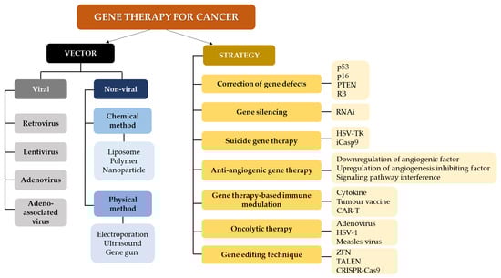 Gene therapy serves as a treatment avenue that can be used in combination with existing and conventional therapies. Strategies in gene therapy usually involve the use of interventional genetic techniques aiming to a) boost the immunological response to the tumor and b) deliver cytotoxic or lethal agents, and/or genes to neoplastic cells, performed via various clinical trials [63]. These are performed through different mechanisms such as including or replacing defect genes, knocking down genes, deactivating malfunction genes, or inserting new genes, which are administered using delivery vehicles or vectors [64]. Figure 2 summarizes the vectors and strategies in gene therapy for cancer [60,65,66,67,68,69,70]. Several treatment modalities which can potentially be incorporated into gene therapy have also been proposed for cancer management, including [71]: