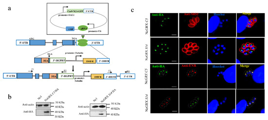 To obtain GRX1-HA parasites, we constructed a pLIC-DHFR-grx S14-HA plasmid for inserting a 3×HA tag into the grx S14 gene 3′ end. The 3′ flank and 5′ flank regions of grx S14 were amplified from the DNA of the Nc1 parasites and inserted into the backbone of the pLIC-DHFR-HA plasmid using seamless cloning (Vazyme Biotech, Co., Ltd., Nanjing, China). The construction strategy of pCRISPR-CAS9 was consistent with the above method. The pLIC-DHFR-grx S14-HA plasmid and pCRISPR-CAS9 plasmids were co-transfected into Nc1 parasites and screened with pyrimethamine.