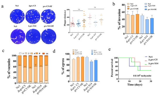 Figure 3. Lack of GRX S14 and GRX C5 alone did not affect the growth of parasites. (a) Plaque assays comparing growth of wild-type, knockout and overexpression parasites. Each well contained 300 parasites, and plaques were stained for 9 days. Plaque areas were counted by randomly selecting at least 20 plaques and measuring the pixel point with Photoshop C6S software (Adobe, San Jose, CA, USA). Data were compiled from three independent experiments. (b) A total of 1 × 105 parasites were inoculated on human foreskin fibroblast (HFF) cells in 12-well plates and cultured for 24 h. IFA was performed with anti-NcSRS2 antibodies and Hoechst staining. The invasion ratio of wild-type, knockout, overexpression and complementary parasites was based on the number of parasite-infecting cells divided by the number of total cells in one horizon. Data are the mean ± SD (error bars) of three independent experiments. Statistical analysis showed no significant difference (Δgrx C5, F(2, 6) = 0.06720, p = 0.9357; Δgrx S14, F(2, 6) = 2.238, p = 0.1879). (c) Intracellular replication of different parasite strains was compiled from three separate assays, with 100 total PVs of each strain counted in each assay. Statistical analysis showed no change (Δgrx C5, F(8, 15) = 0.6462, p = 0.7287; Δgrx S14, F(8, 15) = 0.6732, p =0.7080). (d) The egress ability of parasites was assessed after treatment with the calcium ionophore A23187. IFA was employed to detect the integrity of the parasitophorous vacuole (PV). The average number of ruptured PVs was determined by counting 100 random vacuoles per slide. Statistical analysis showed no significant difference (Δgrx C5, F(2, 6) = 2.734, p = 0.1432; Δgrx S14, F(2, 6) = 3.622, p = 0.0930). (e) Mouse survival after infection with different strains. BALB/c mice (n = 5) were injected intraperitoneally with 8 × 106 doses of parasites. Statistical analysis was performed using the survival curve of GraphPad Prism (San Diego, CA, USA).