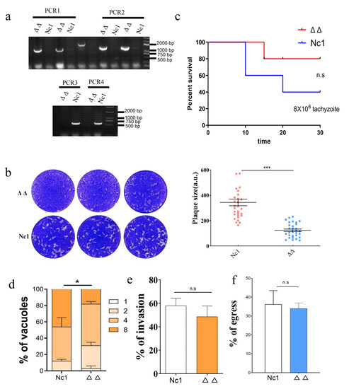 Figure 4. Lack of GRX S14 and GRX C5 together affected the growth of parasites. (a) PCR identification of the Δgrx S14 Δgrx C5 strain. PCR1 and PCR2 suggest successful homologous integration; in PCR3 and PCR4, fragments of grx S14 and grx C5 were amplified. (b) Plaque assay comparing the growth of wild-type and knockout parasites. (c) Mouse survival after infection with different strains. (d) Intracellular replication of Δgrx S14 Δgrx C5 compared with Nc1 parasites. Asterisks indicate statistically significant results. (e) Invasion assay of Δgrx S14 Δgrx C5 and Nc1 parasites. (f) The egress ability of Δgrx S14 Δgrx C5 and Nc1 parasites. Statistical analysis was performed using GraphPad Prism (San Diego, CA, USA). n.s: not significant means, *** p < 0.001, and * p < 0.01.