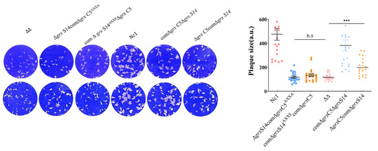 Figure 5. Phenotypes of strains with mutations of key amino acids. Plaque assay comparing growth of the comΔgrx S14AXXSΔgrx C5, Δgrx S14comΔgrx C5AXXA, comΔgrx S14Δgrx C5, Δgrx S14comΔgrx C5, Δgrx S14Δgrx C5 and Nc1 parasites. n.s: not significant means, *** p < 0.001.