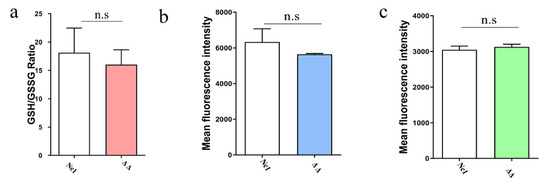 Figure 6. grx C5 and grx S14 double-gene deficiency did not affect the levels of GSH, ROS and OH. (a) Δgrx S14Δgrx C5 and Nc1 parasites were collected and lysed by three cycles of freezing in liquid nitrogen and thawing at 37 °C. The supernatant of each sample was collected for GSH and GSSG measurement. The GSH/GSSG ratio was calculated, as represented by bar charts according to three independent experiments. (b) Reactive oxygen species (ROS) levels of parasites under oxidative stress were determined by FACS analysis using DCFH-DA, whereby the mean fluorescence intensity reflected the ROS level in parasites. (c) The hydroxyl radical (OH) content was detected by FACS analysis, with the mean fluorescence intensity reflecting the hydroxyl radical level. n.s: not significant means.