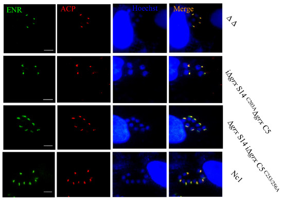 Previous research showed that thioredoxins contributed to the control of protein trafficking to the apicoplast [17]. The localization of the apicoplast proteins, the enoyl acyl carrier protein reductase (ENR) and acyl carrier protein (ACP), was observed in Nc1, Δgrx S14Δgrx C5, comΔgrx S14AXXSΔgrx C5, Δgrx S14comΔgrx C5AXXA, Δgrx S14comΔgrx C5 and comΔgrx S14Δgrx C5. As the localization of the apicoplast proteins ENR and ACP in the deletion or mutant strain was normal (Figure 7), GRX S14 and GRX C5 do not appear to influence protein trafficking to the apicoplast.