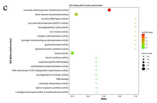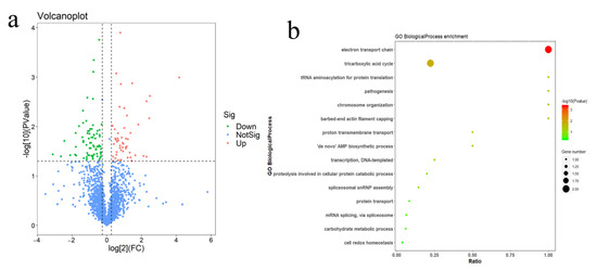 To explore which pathways of the parasite are affected by double-gene depletion, we performed a comparative proteomic analysis between Δgrx S14Δgrx C5 and the Nc1 parasites. The Δgrx S14Δgrx C5 parasites showed a significant downregulation of 29 proteins (fold change > 2, p-value < 0.05, Figure 8a). According to GO enrichment analysis, the biological functions of the proteins with downregulated expressions were mainly related to the electron transport chain and tricarboxylic acid cycle (Figure 8b,c).