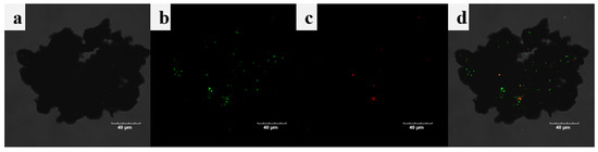 CLSM micrographs of the co-immobilized lipases onto mMWCNTs@4-arm-PEG-NH2; (a) bright-field micrograph; (b) dark field of RhB-labeled CRL fluorescence micrograph (c); dark field of FITC-labeled ROL fluorescence micrograph (d); overlay of a bright field, RhB-labeled CRL and FITC-labeled ROL fluorescence micrograph.