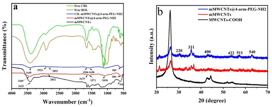 Figure 5a shows the FT-IR spectra of the synthesized samples. As shown, mMWCNTs, mMWCNTs@4-arm-PEG-NH2, and CIL-mMWCNTs@4-arm-PEG-NH2 spectra were exhibited distinctly strong absorption bands at the peaks 595, 580, and 585 cm−1, respectively, attributed to the Fe–O bond from Fe3O4. Bands at 1090, 1571, and 2852 cm−1 in the mMWCNTs@4-arm-PEG-NH2 spectrum were corresponding to C-O, N-H, and C-H vibrations, respectively, proving that 4-arm-PEG-NH2 had been grafted onto mMWCNTs, respectively [33]. Moreover, additional bands were observed in the CIL-mMWCNTs@4-arm-PEG-NH2 spectrum at peaks 2853 and 2922 cm−1, dedicated to C-H stretching vibrations of the glutaraldehyde and lipases [38]. The absorption bands detected between 1550 and 1650 cm−1 peaks are characteristics of the amide I band, (C=O stretching, 1650 cm−1) and amide II band (N-H bending, 1550 cm−1) vibrations of the protein [39], indicating that the lipases were successfully co-immobilized on the support. Additionally, there are additional peaks on the supports between 3420 and 3450 cm−1 that could be attributed to amino acid −OH vibrations [39].