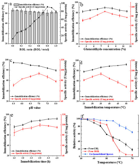 Effects of immobilization conditions on the immobilization efficiency and specific activity of CIL-mMWCNTs@ 4-arm-PEG-NH2: (a) ROL ratio; (b) glutaraldehyde concentration; (c) pH value; (d) immobilization temperature; (e) immobilization time; (f) thermo-stability of co-immobilized lipases. The optimal immobilization conditions were 4:1 ROL: CRL ratio; 7.5 wt.% glutaraldehyde concentration; 7.0 pH value; 35 °C immobilization temperature; 3 h immobilization time.