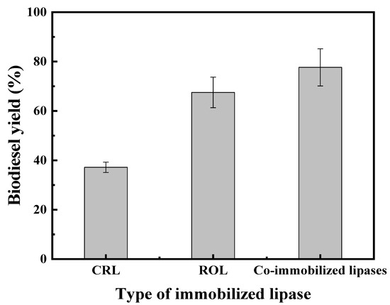Various immobilization techniques, such as co-immobilized lipases (CIL) [13,22,23,24] and a mixture of immobilized lipases (MIL) [12,25], have been used to enhance biodiesel production rates. From an environmental and economic standpoint, co-immobilization of multi-enzymes is a powerful method with numerous advantages, such as avoiding mass transfer restrictions, eliminating product contamination, preventing inactivation by intermediate products, and increasing the reaction speed [14]. The primary objective of co-immobilization was to overcome the mass transfer restrictions imposed by reactants and to enhance the reaction rate and speed [13]. There are a few previous studies using co-immobilized lipases for biodiesel production. Among them, Lee et al. reported the simultaneous immobilization of Candida rugosa lipase and Rhizopus oryzae lipase onto silica gel [22] and silanizated activated carbon [23]. They confirmed that there is a synergetic effect between CRL and ROL, and that the combination enzymes produced higher yields of biodiesel than either CRL or ROL alone.