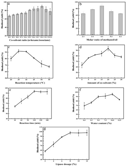 Effect of different transesterification parameters on the yield of biodiesel (%): (a) co-solvent ratio; (b) molar ratio of methanol to oil; (c) reaction temperature; (d) amount of co-solvent; (e) reaction time; (f) water content; (g) lipase dosage. The optimal conditions were the following: 1:4 n-hexane to isooctane ratio; 4:1 molar ratio of methanol to oil; 35 ± 1 °C reaction temperature; 20% co-solvent; 120 min reaction time; 8% lipase dosage.