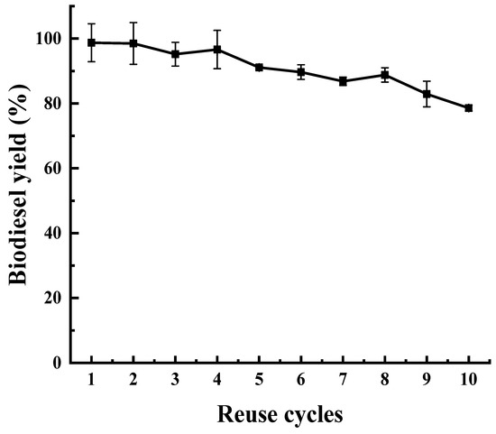 Effect of reuse of co-immobilized lipase on the yield of biodiesel (%). Reaction parameters were as follows: 4:1 molar ratio of methanol to oil (methanol was added 3 times at intervals of 40 min); 20% co-solvent; 10% water content; 8% lipase dosage; at 35 ± 1 °C; 120 min reaction time; under ultrasound-assisted parameters of 40% power and 40 kHz frequency (all % based on oil weight).