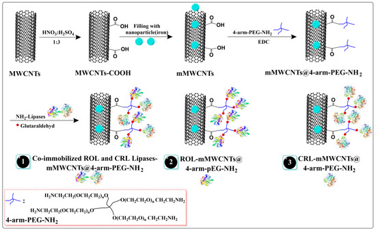 In order to collect excellent characteristics (such as simplicity of separation and recovery, and suitable active sites) onto a single support for enzyme immobilization, in this study, hyperbranched-functionalized CNTs, encapsulated with magnetic Fe3O4 nanoparticles, were prepared. The characterization results indicated that the surface of mMWCNTs provided sufficient active sites for co-immobilization of two lipases, following the grafting process. The mMWCNTs@4-arm-PEG-NH2 exhibited a rapid response to an externally applied magnetic field, indicating that this degree of saturation magnetization is sufficient for immobilized enzyme separation.