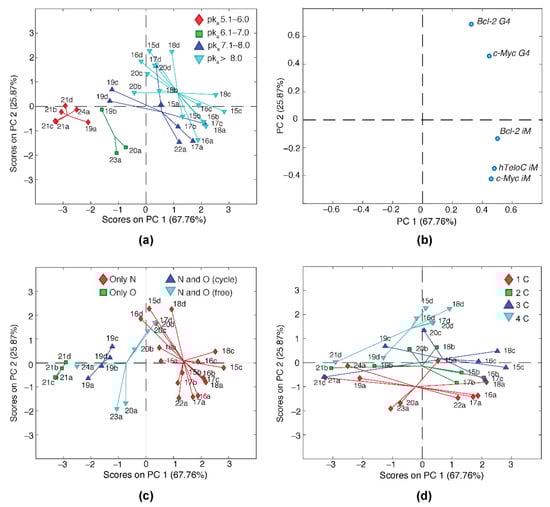 Output of the PCA model performed on the ΔT1/2 values dataset of the 31 compounds tested on Bcl-2 G4, c-Myc G4, Bcl-2 iM, c-Myc iM, and hTeloC iM DNAs. PC1/PC2 scores plot colored according to the (a) pKa value corresponding to the conjugated acid of the strongest basic group in each molecule (c) presence/absence of both nitrogen and oxygen atoms in the side chains, and (d) length of the R side chain (from 1 up to 4 carbons); (b) PC1/PC2 loadings plot.