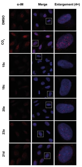 Biological evaluation of the iM-destabilizing activity of the selected compounds. Immunofluorescence analysis of iM structures in U2OS cells treated for 24 h with 2 µM of the selected compounds or an equivalent amount of DMSO (negative control). As a positive control, cells were maintained for 2.5 h in an atmosphere with 8% of CO2. Representative images of confocal sections (63×) used to detect iM structures are shown. Left panels: iM structures (red) detected by anti-iM antibody (-iM). Middle panels: merged images showing iM structures (red) and DAPI counterstained nuclei (blue). Right panels: 4× enlargements from the pictures in the middle panels. The experiment was performed in triplicate and at least 9 fields/experiments were evaluated for each condition. Scale bars are reported in the figures.