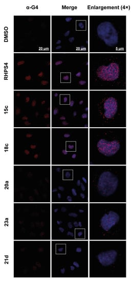 Biological evaluation of G4-stabilizing activity of the selected compounds. Immunofluorescence analysis of G4 structures in U2OS cells treated for 24 h with 2 µM of the selected compounds or an equivalent amount of DMSO (negative control). As a positive control, cells were treated for 24 h with 1 µM RHPS4. Representative images of confocal sections (63×) used for the detection of G4 structures are shown. Left panels: G4 structures (red) detected by anti-G4 antibody (-G4). Middle panels: merged images showing G4 structures (red) and DAPI counterstained nuclei (blue). Right panels: 4× enlargements from the pictures in the middle panels. The experiment was performed in triplicate and at least 9 fields/experiments were evaluated for each condition. Scale bars are reported in the figures.
