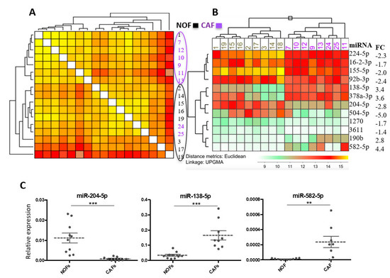 (A) Unsupervised hierarchical sample clustering of CAFs and NOFs for miR expression. (B) Clustering analysis by fibroblast type for 12 significantly differentially regulated miRs (SAM analysis). Significantly altered miRs (FDR = 0) and corresponding fold changes (FCs) on the right. (C) miR validation of microarray results by qRT-PCR (** p < 0.005, *** p < 0.0005).