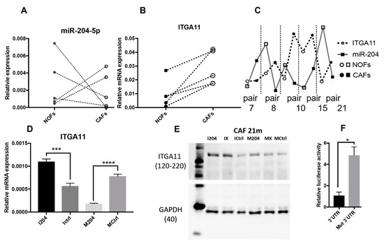 ITGA11 and its regulation by miR-204: relative expression of (A) miR-204 and (B) ITGA11 in NOFs compared with matched CAFs (connected by dotted lines), and the corresponding (C) expression correlation between miR-204 and ITGA11. (D) mRNA and (E) protein (Western blot image) regulation of ITGA11 by miR204, 48 h post transfection. (F) Luciferase activity in CAFs in one with miR-204 target site and another with mutated sequence in 3′ UTR for ITGA11 in miR target reporter assay (* p < 0.05, *** p < 0.0005, **** p < 0.00005, unpaired Student’s t-test, n = 4).