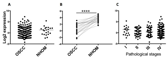Graphs showing expression of miR-204 in OSCC (TCGA data): (A) No significant difference between miR204 expression in OSCC compared with normal tissues (Mann-Whitney test; n = 251 OSCC, n = 21 NHOM). (B) A significant difference was detected between miR-204 expression in matched OSCC-NHOM cases (paired t-test; n = 20, matched cases are linked by a dotted line, **** p < 0.00005). (C) No significant difference in miR-204 expression among different OSCC stages (Kruskal-Wallis test showed no significant difference between different stages, although a trend for decreased expression from stage I to more advanced stages could be observed).