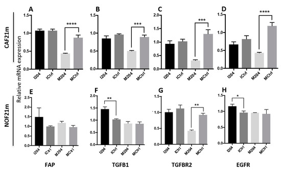 Regulation of CAF-related transcripts by miR-204 ((* p < 0.05, ** p < 0.005, *** p < 0.0005, and **** p < 0.0001, unpaired Student’s t-test, n = 3). (A,E) FAP expression; (B,F) TGFB1 expression; (C,G) TGFB2 expression; and (D,H) EGFR expression in CAF21m and NOF21m respectively.