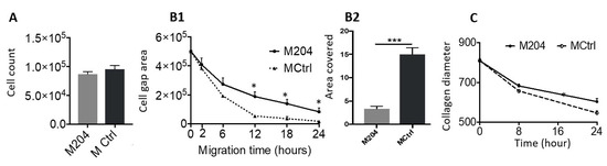Regulation of (A) CAF proliferation, (B1) CAF migration alone, and (B2) in interaction with UK1 and (C) CAF collagen contraction ability post miR-204 transfection (n = 6) (* p < 0.05, *** p < 0.0005).