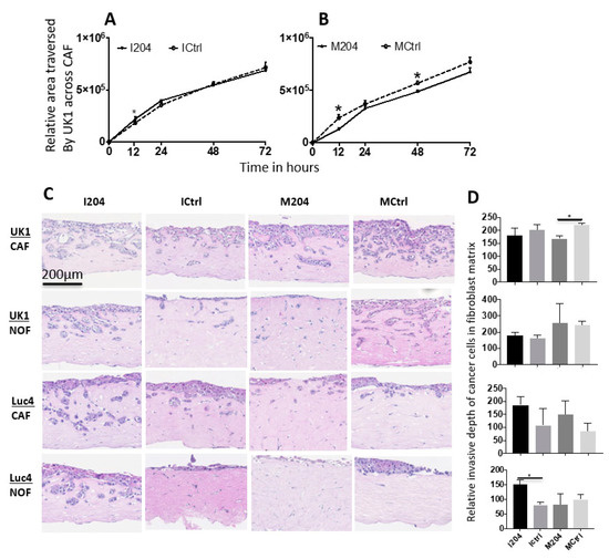 (A,B) Graphs showing quantification of the area traversed by UK1 across the gap towards CAFs at different time points from the baseline post miR-204 modulation in CAFs in UK1-CAF monolayer co-culture (n = 4). (C) Representative pictures from 3D organotypic cultures showing the invasion by OSCC cell lines UK1 and Luc4 in post miR-204 modulated fibroblasts-populated collagen matrices and (D) the corresponding graphs depicting the quantification of invasion depths (n = 4, unpaired t-test, * p < 0.05).