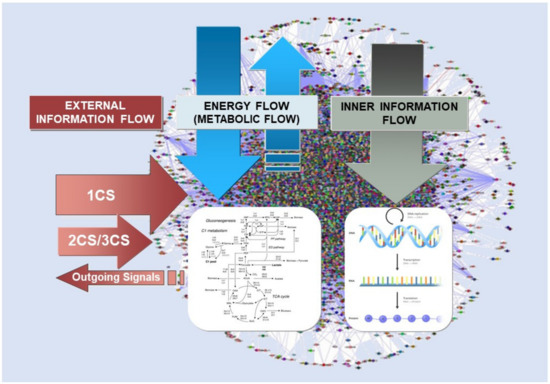 Regarding the classes to distinguish, we have to consider another information flow, from DNA to RNA to proteins, as the Central Dogma describes. By contraposition to our “external” information flow, we may call it “internal”. This internal information flow, we will see, is always disturbed or activated by the multiple signaling pathways that intercept the external information flow. Complete congruence is achieved in functional terms between these two information flows, the external and the internal. Actually, we will find that there is a partial physical mixing of both flows in the intracellular ”common pool” of substrates, products, and effectors. At the same time, the energy flow is materialized via the accesses opened by the signaling pathways and becomes incorporated into the intracellular common pool that supports self-construction and self-maintenance.