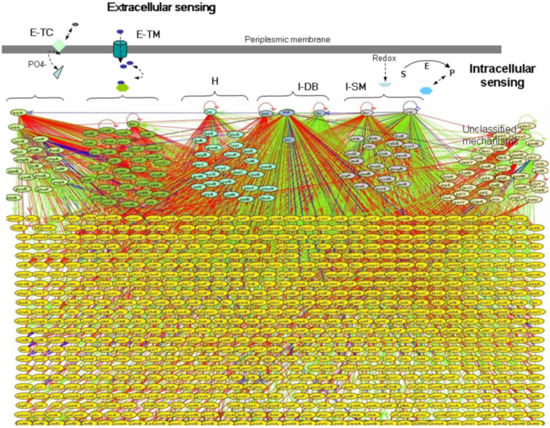 We can see in Figure 2 a good portion of the E. coli transcriptional system (almost half of the genes) that precisely responds to the above CSs [53,54,55]. We see represented in different colors (as described in detail in the legend of Figure 2) the distinct sensing realms that impinge upon gene transcription: the external sensed by 2CSs, in addition to the external transported, the hybrid external–internal, the purely internal, the global states, and the DNA sensing, most of them covered by 1CSs (following the order from left to right in the upper part of the Figure 2). We can also appreciate in Figure 2 that most transcription factors (TFs) play inhibitory roles (in red color), repressing, with high specificity, scores of genes already activated by sigma factors; their transcription will be allowed only when specific molecular signals activate those TFs (usually via 1CSs). There is a very important rationale about the predominance of inhibition. In fact, only 30% or 40% of the E. coli’s genome can be actively transcribed at any given time. There are several limits: the solvation capability of intracellular water, the transcriptional and translational functional capacities, and the tight energy budget of the cell. Given that less than 1/3 of the big genome can be expressed concurrently, a careful balance of inhibition/activation has to be imposed upon the transcriptional regime, with predominance of inhibition.