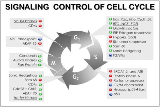 In eukaryotes, the populational control of the different phases of the cell cycle (G1, S, G2, M) appears to be based on a cloud of internal and external signals, usually of opposed signs, carefully regulating the reproductive and specialization trajectories of cells and tissues—in general, growth factors versus apoptotic factors (see Figure 3). It is this balance between opposing factors, probably reflecting ancestral antiviral strategies [66], that propels cellular growth; eliminates transformed, senescent, or redundant cells; and keeps organs and tissues within their functional bounds. It is based on cross-road processes in which metabolic state, cell cycle state, and external signals are gauged together, converging in fundamental “checkpoints” where the fate of the whole cell is decided [67,68].