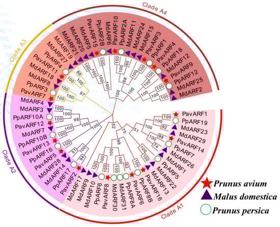 To know more about the conserved domains in PavARF, the PavARFs were aligned (Figure S1). The results show that these sequences have a certain degree of similarity, and two highly conserved domains (DBD and ARF Domain) were identified. However, not all the PavARFs contain a CTD domain, such as PavARF5/7/12/13, while the DBD domain was not found in PavARF3. Phylogenetic analysis involving the deduced protein sequences of the 16 PavARF, 17 PpARF of the Prunus persica (peach) [] and 31 MdARF of Malus domestica (apple) [] was performed. The phylogenetic tree of ARF proteins was divided into four classes (clade A1, clade A2, clade A3 and clade A4) (Figure 1). Most of the members of PavARF were distributed in the cladeA1 subgroup, and the four members that activate transcriptional activation belong to the cladeA1 subgroup. Among the 16 PavARF proteins, 5 belong to clade A1, 4 to clade A2, 2 to clade A3, and clade A4 have 5. Genes in the same subfamily may have evolved from the same gene duplication event, and their functions may also be similar.
