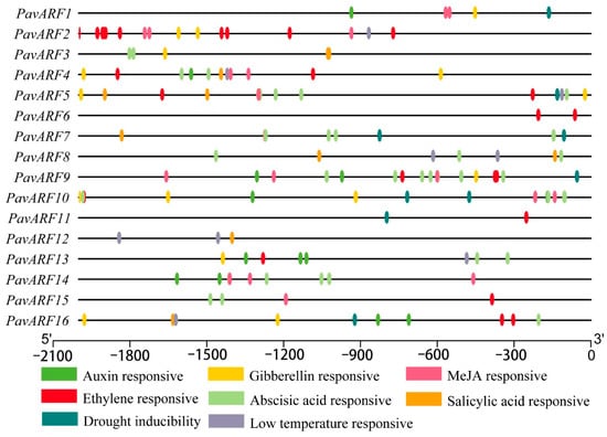 Analysis of specific cis-elements in PavARF promoters. The 2000 bp upstream sequences were used to analyze six specific phytohormone-related cis-elements (auxin, gibberellin, MeJA, ethylene, abscisic acid and salicylic acid), two stress-responsive regulatory elements including drought and low-temperature. They are illustrated by the different color boxes.