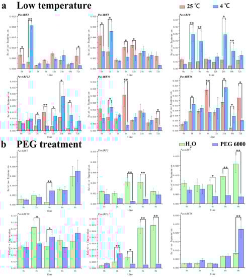 The upstream promoter sequences of some members of PavARF contain cis-sequences associated with abiotic stress. PavARF2/5/8/12/13/16 is an example that contained a low-temperature response component, while PavARF1/5/7/10/11/16 was related to the induction of drought. To verify the changes of these genes under the stress of cold and drought, an analysis performed regarding their expression levels in these conditions. Under low temperature (Figure 7a), the expression level of PavARF2/5/8/12/13/16 will increase within 1 h and was significantly higher than the control (25 ℃) without PavARF12, but it had a downward trend thereafter. The expression level inclined again at 24 h and then declined gradually. In addition, PavARF8/12 has two low temperature response elements, and both genes have higher expression levels under low temperature. These two genes may be similar or complementary in function (overlapping functions), and they play an important regulatory role in the corresponding low temperature treatment [].