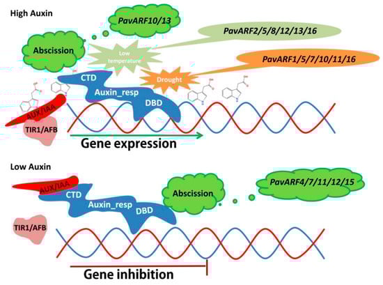 The expression patterns of sweet cherry ARF gene family members during fruit shedding, drought and low temperature stress. Under drought, low temperature and shedding, PavARF binds to AuxRE elements under the action of auxin to initiate gene expression. For other genes, when the auxin is low, PavARF binds to AUX/IAA, and the gene expression is inhibited.