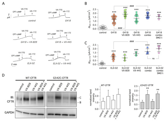 Pharmacological rescue of G542X-CFTR mutant. (A) Representative short-circuit current recordings from the 16HBE14o- bronchial epithelial cell line carrying the G542X mutation in the CFTR gene. Before recordings, cells were treated for 24 h with G418 (0.5 mg/mL) or ELX-02 (0.5 mg/mL) alone or in combination with VX-809 (1 µM), VX-445 (5 µM), the two correctors together (combo), with/without SMG1i (1 µM). During recordings, cells were first stimulated with the membrane-permeable cAMP analog (CPT-cAMP, 100 µM) and then with VX-770 (1 µM), to induce CFTR activation. CFTR activity was then inhibited with inh-172 (10 µM). Pharmacological rescue results in a higher CFTR activity as indicated by the larger amplitude of inh-172 effect. (B) Summary of data obtained with G418 as readthrough agent, with/without correctors and SMG1i. The scatter dot plot reports the amplitude of the current drop elicited by inh-172 for the indicated conditions. ***, p < 0.001 vs. control. ###, p < 0.001 vs. G418. (C) Summary of data obtained with ELX-02 as readthrough agent, with/without other compounds. ***, p < 0.001 vs. control; ###, p < 0.001 vs. ELX-02; ns, not significant. (D) Immunoblot analysis of wild-type and G542C-CFTR protein processing. The image (left) shows a representative Western blot experiment performed on lysates of HEK293 cells transiently transfected with wild-type or G542C-CFTR plasmids and treated for 24 h with VX-809 (1 µM) and/or VX-445 (5 µM). The B and C bands correspond to partially and fully glycosylated forms of CFTR protein. The bar graphs (right) summarize the C band intensity (normalized for GAPDH expression) from Western blot experiments. **, p < 0.01 vs. control (n = 4).