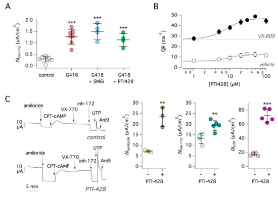 Functional analysis of PTI-428 and SMG1i. (A) The scatter dot plot reports CFTR function (i.e., current sensitive to inh-172) in 16HBE14o- cells expressing G542X-CFTR treated for 24 h with G418 (0.5 mg/mL) alone or in combination with SMG1i (1 µM) or PTI-428 (30 µM). SMG1i and PTI-428 appear ineffective under these conditions. ***, p < 0.001 vs. control. (B) Rescue of F508del-CFTR function by PTI-428. CFBE41o- cells expressing F508del-CFTR were treated for 24 h with the indicated PTI-428 concentrations, in the presence of absence of VX-809 (1 µM). Data (quenching rate, QR), obtained with the HS-YFP assay, were fitted with a Hill function. Dashed lines indicate the activity with VX-809 or vehicle alone. (C) Representative traces (left) show Ussing chamber experiments done on non-CF primary bronchial epithelial cells. Cells were treated for 24 h with the CFTR amplifier PTI-428 (30 µM) or vehicle (DMSO) alone. During recordings, the function of three channels was evaluated: (i) for the epithelial Na+ channel (ENaC), we measured the amplitude of amiloride (10 µM) effect; (ii) for CFTR function, we measured the effect of inh-172 after maximal stimulation with CPT-cAMP; (iii) for the activity of the Ca2+-activated Cl− channel TMEM16A, we measured the maximal amplitude of the current elicited with UTP (100 µM). Ani9 (5 µM) was added to inhibit TMEM16A at the end of the experiments. The scatter dot plot (right) reports the function of ENaC, CFTR, and TMEM16A in cells treated with PTI-428 or vehicle. **, p < 0.01; ***, p < 0.001 vs. control.