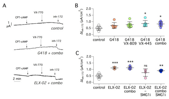 Pharmacological rescue of R553X-CFTR mutant. (A) Representative short-circuit current traces from experiments on 16HBE14o- cells expressing R553X-CFTR. (B,C) Summary of functional data obtained after treating the cells for 24 h with different combinations of readthrough agents (G418 or ELX-02, 0.5 mg/mL), VX-809 (1 µM), VX-445 (5 µM), VX-809 plus VX-445 (combo), and SMG1i (1 µM). *, p < 0.05 vs. control; **, p < 0.01 vs. control; ***, p < 0.001 vs. control; ns, not significant.