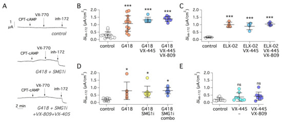 Pharmacological rescue of R1162X-CFTR mutant. (A) Representative short-circuit current traces from experiments on 16HBE14o- cells expressing R1162X-CFTR. (B,C) Scatter dot plots summarizing the effect of G418 or ELX-02 (both at 0.5 mg/mL) with/without correctors VX-809 (1 µM) and VX-445 (5 µM). ***, p < 0.001 vs. control. (D) Data obtained with G418, with/without SMG1i (1 µM), and VX-809/VX-445 (combo). *, p < 0.01 vs. control. (E) Data obtained with CFTR correctors, VX-809 (1 µM) and VX-445 (5 µM), in the absence of readthrough agents or NMD inhibitor. ns, not significant.