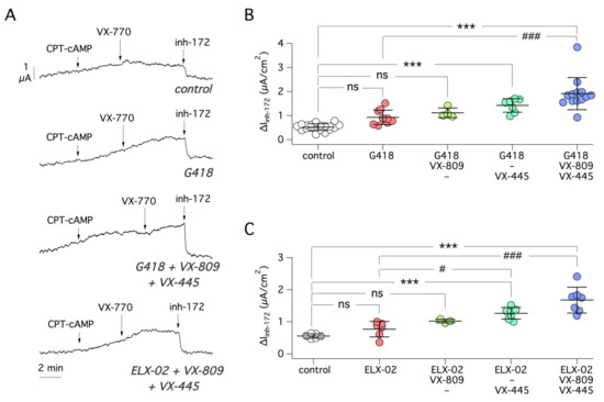 Evaluation of readthrough agents on W1282X-CFTR. (A) Representative short-circuit current traces from 16HBE14o- cells expressing W1282X-CFTR, treated for 24 h with the indicated compounds. (B,C) Summary of data reporting CFTR function (amplitude of inh-172 effect). Cells were treated with G418 0.5 mg/mL or ELX-02 0.5 mg/mL, alone or in combination with CFTR correctors VX-809 (1 µM) and/or VX-445 (5 µM). ***, p < 0.001 vs. control. #, p < 0.05; ###, p < 0.001 vs. G418 or ELX-02.
