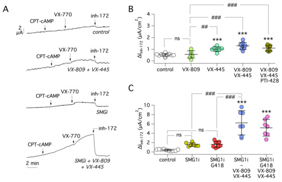 Sensitivity of W1282X-CFTR to correctors and SMG1i. (A) Representative short-circuit current traces from 16HBE14o- cells expressing W1282X-CFTR. Cells were treated for 24 h with indicated compounds. (B) Scatter dot plot summarizing the results obtained after treatments with CFTR correctors (VX-445, 5 µm; VX-809, 1 µM) and PTI-428 (30 µM). ***, p < 0.001 vs. control. ##, p < 0.01; ###, p < 0.001 vs. VX-809. (C) Scatter dot plot summarizing the results obtained with SMG1i (1 µM) with/without the indicated combinations of compounds (VX-445, 5 µM; VX-809, 1 µM; G418, 0.5 mg/mL). ***, p < 0.001 vs. control. ###, p < 0.001 vs. SMG1i or SMG1i plus G418.