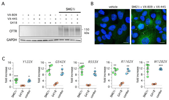Molecular analysis of SMG1i effects. (A) Representative Western blot experiment performed on 16HBE14o- cells expressing W1282X-CFTR. Cells were treated for 24 h with the different combinations of indicated compounds. Treatment with SMG1i (1 µM) was required to evoke the appearance of CFTR protein. The apparent molecular size of the rescued protein is smaller than wild-type CFTR, in agreement with the presence of the truncating mutation. (B) Representative confocal microscopy images obtained from 16HBE14o- cells expressing W1282X-CFTR mutation under control condition or after treatment with SMG1i (1 µM) + VX-809 (1 µM) + VX-445 (5 µM). CFTR expression and localization was detected by staining with a specific antibody (green signal). Treatment causes the appearance of CFTR signal in the cytosol and at the plasma membrane (arrows). Nuclei (DAPI staining) are shown in blue. Scale bar: 10 µm. (C) Results of real-time RT-PCR experiments to evaluate CFTR mRNA levels in 16HBE14o- cells with the indicated mutations. Before RNA extraction, cells were treated for 24 h with G418 (0.5 mg/mL), SMG1i (1 µM), or with the combination of the two compounds (combo). The scatter dot plots show CFTR transcript fold-change relative to control condition for every mutation. All values were normalized to B2M. The p value was determined using one-sample t-test. *, p < 0.05; **, p < 0.01; ***, p < 0.001 vs. control (dashed line).