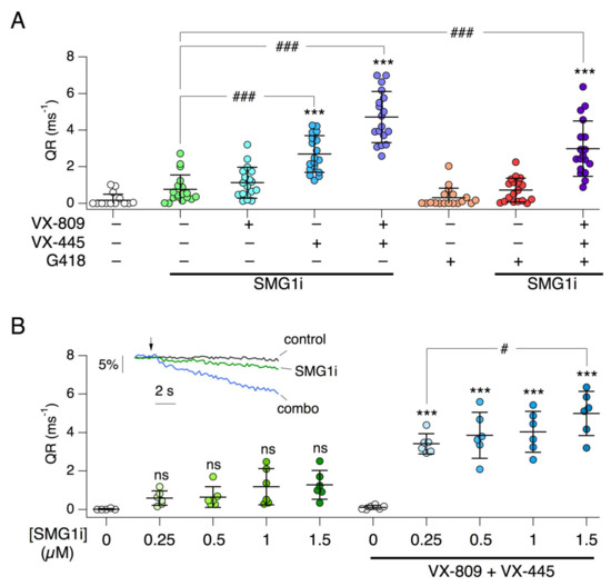 Functional analysis of W1282X-CFTR rescue with the HS-YFP assay. (A) Scatter dot plot reporting W1282X-CFTR activity (quenching rate, QR) in cells treated with the indicated combinations of compounds: SMG1i (1 µM), VX-809 (1 µM), VX-445 (5 µM), G418 (0.5 mg/mL). ***, p < 0.001 vs. control. ###, p < 0.001 vs. SMG1i alone. (B) Dose–response relationship for SMG1i in the absence and in the presence of CFTR correctors. ***, p < 0.001 vs. no SMG1i. #, p < 0.05 between indicated conditions. The inset shows representative traces from the HS-YFP assay in which iodide-rich solution is added (arrow) to start fluorescence quenching caused by iodide influx through CFTR. Conditions were vehicle alone (control), 1 µM SMG1i, and the combination of SMG1i plus VX-809 and VX-445 (combo).