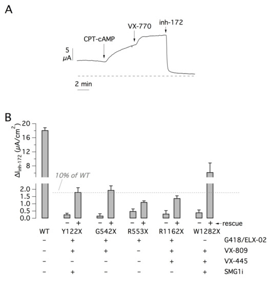 Summarizing, we obtained several important indications that may guide a precision medicine approach for treating patients with PTCs. As also indicated by previous studies [42,43], W1282X appears as the most promising mutation to treat, given the large extent of rescue obtained at the functional level. This result requires a combination of NMD suppression and CFTR correction, without inclusion of a readthrough agent that could even exert detrimental effects [42]. We even found in 16HBE14o- cells a small but significant response to correctors in the absence of SMG1i, thus suggesting the presence of a certain level of mRNA escape from NMD. Our study indicates that, in contrast with the other mutations, VX-445 is the appropriate corrector to include since in its absence there is no effect at the functional level. Therefore, treatments including this agent, as the triple drug Trikafta combination that consists of VX-445 plus VX-661 and VX-770, are expected to be beneficial, also taking into consideration the potentiation effect achieved with VX-770. However, other inhibitors of NMD are needed since SMG1i is expected to generate undesired side effects in vivo [43]. In this respect, it is believed that NMD factors cannot be completely shut down since they play an important general role in gene expression regulation [49]. A possible strategy is to modulate regulatory steps of NMD that, instead of totally blocking this pathway, induce a partial inhibition that is tolerated by the organism but is still effective in rescuing CFTR mRNA from degradation. It has also to be considered that the extent of NMD shows inter-individual variability [50]. Therefore, patients with a lower level of NMD could be more sensitive to CFTR correction/potentiation, with a reduced requirement of NMD inhibitors.