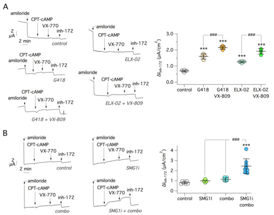 To further validate our results, we carried out experiments on native bronchial epithelial cells from CF patients with nonsense mutations. First, we studied cells from a patient carrying the G542X and 1717-1G > A mutations. The second mutation affects a canonical splice site leading to full disruption of CF protein synthesis [39]. It is therefore an unrescuable mutation [40]. Epithelia generated from the cells of this patient were studied with short-circuit current recordings. In agreement with data obtained in 16HBE14o- cells carrying the G542X mutation, we found a significant rescue following treatment with G418 or ELX-02 (Figure 11A). The effect of the readthrough agents was enhanced by VX-809 (Figure 11A).