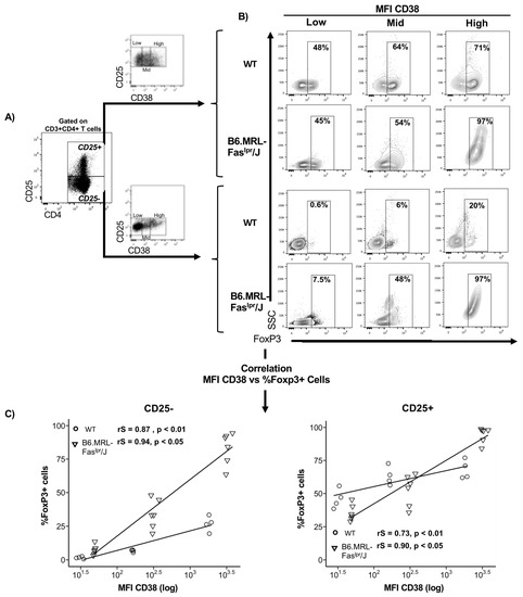 The level of CD38 correlates with FoxP3 frequency in T CD25+ and CD25− T-cells. Splenocytes were stained for cell surface expression of CD3, CD4, CD25, and CD38. The stained cells were fixed and stained intracellularly for FoxP3. (A) Splenocytes from wild type (WT) and B6.MRL-Faslpr/J were gated on CD3+CD4+ cells and analyzed for CD25 expression. Then, CD3+CD4+CD25+ or CD25− cells were gated on CD38low, CD38mid, or CD38high, according to CD38 expression; (B) counter plots showing FoxP3+ cells frequency in CD38low, CD38mid, or CD38high subsets among CD25+ and CD25− T-cells from WT and B6.MRL-Faslpr/J; (C) correlation plots comparing MFI of CD38 to FoxP3+ cells within either CD4+CD25− T-cells (top) or CD4+CD25+ T-cells (bottom). Symbols represenT-cells from WT (n = 4) (open symbols) and B6.MRL-Faslpr/J (n = 6) (filled symbols). The inset lines are the product of linear regression analysis. Correlations were calculated by the Spearman method.