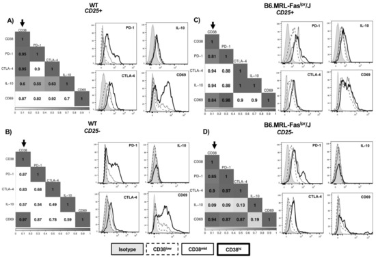 CD38 correlates with immunosuppressive molecules. Correlation matrix and histograms of PD-1, CTLA-4, IL-10, and CD69 expression within CD38low (dashed line), CD38mid (black line), and CD38high (heavy line) subsets in (A) WT CD4+CD25+ T-cells (n = 6); (B) WT CD4+CD25− cells (n = 6); (C) B6.MRL-Faslpr/J CD4+CD25+ T-cells (n = 6); and (D) B6.MRL-Faslpr/J CD4+CD25− T-cells (n = 6). Darker squares into correlation matrices point out a correlation close to 1. Shaded squares indicate correlations with a p < 0.005, while blank squares show non-significative correlations.