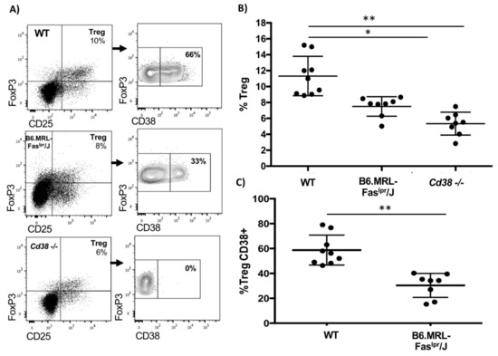 2.3. Reduced CD38+ Treg Proportion in B6.MRL-Faslpr/J Mice