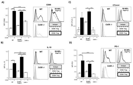 Treg from CD38-/- showed a reduction in immunosuppressive molecules. Histograms and bar charts represent the expression of (A) CD69, (B) IL-10, (C) CTLA-4, and (D) PD-1 among CD38− and CD38+ Treg cells from WT (n = 4) and B6.MRL-Faslpr/J (n = 4) mice or splenic Treg cells from CD38-/- (n = 4) mice. Bar charts show mean ± SD. Statistical analysis was performed using two-way ANOVA followed by Tukey test, where *** p < 0.0001, ** p < 0.001, and * p < 0.05.