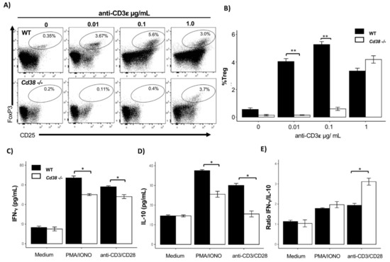 Splenocytes stimulated with anti-CD3/CD28 + rhIL2 or mitogens such as phorbol myristate acetate plus ionomycin (PMA/IONO) promote the release of pro-inflammatory and anti-inflammatory cytokines such as IFN-γ and IL-10, respectively [35,36]. A good balance between the pro-inflammatory IFN-γ and anti-inflammatory IL-10 is an indicator of reciprocal immune regulation [37,38]. Therefore, to understand the role of CD38 in this phenomenon, we analyzed the ability of the expanded splenocytes from CD38-/- mice to produce IFN-γ that might either enhance or abrogate Treg function. Analysis of culture supernatants of CD38-/- splenocytes stimulated with anti-CD3/CD28 + rhIL2 and PMA/IONO showed a reduced concentration of IFN-γ and IL-10 compared to supernatants of WT splenocytes (Figure 5C,D). In addition, the ratio of IFN-γ/IL-10 was detected to be significantly higher in supernatants from CD38-/- stimulated splenocytes, compared with WT splenocytes (Figure 5E).