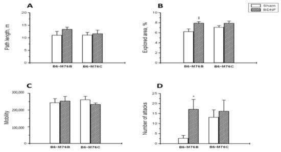 B6-M76B mice treated with BDNF showed a higher number of attacks in the resident–intruder test compared with mice from the sham group (p < 0.05) (Figure 1D). Meanwhile, two-way ANOVA revealed only an effect of the treatment (F1.29 = 3.9, p < 0.05), but not for the genotype (F1.29 = 1.2, p > 0.05) or the treatment x genotype interaction (F1.29 = 1.6, p > 0.05). It is noteworthy that B6-M76B mice of the sham group demonstrated fewer instances of attack than B6-M76C mice from the sham group; however, this difference was below the significance threshold (p = 0.08) (Figure 1D). At the same time, BDNF did not affect the duration of time of attacks: two-way ANOVA showed no effect for the treatment (F1.29 = 0.5, p > 0.05), the genotype (F1.29 = 2.0, p > 0.05) or the treatment x genotype interaction (F1.29 = 0.4, p > 0.05). The duration of time of attacks was, for the B6-M76B line: control group—13.0 ± 8.4 s, BDNF group—41.2 ± 14.4 s. For the B6-M76C line: control group—31.7 ± 10.2 s, BDNF group—41.8 ± 17.0 s.
